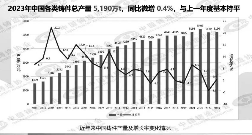 中国作为全球铸造行业的领军者,其铸件产量长期稳居世界第一。根据数据统计,2023年中国铸件总产高达5,190万吨,与上一年度基本持平,占全球总产量的60%以上,几乎是第二大生产国的四倍。随着近年来工艺、环保、安全等各项要求的提升,及铸造产业高质量发展的需求,铸造企业数量减少幅度较大,截至目前全国铸造企业数量大约在2万家左右,产业集中度、企业平均规模有了较大幅度的提升。